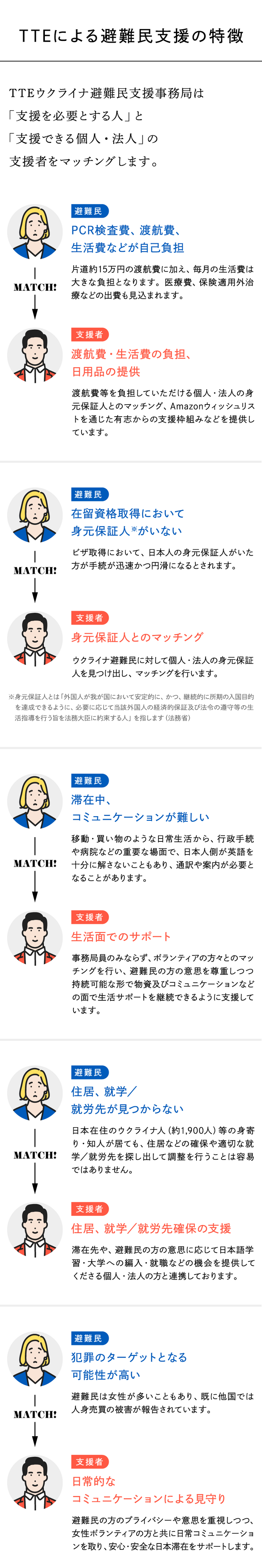 その中のウクライナ避難民支援事務局は、日本への渡航を希望するウクライナ避難民を対象に、「必要な支援を、必要な避難民に」しっかり届けることを目的としております。法務省出入国在留管理庁にも支援団体として情報提供・登録しました。