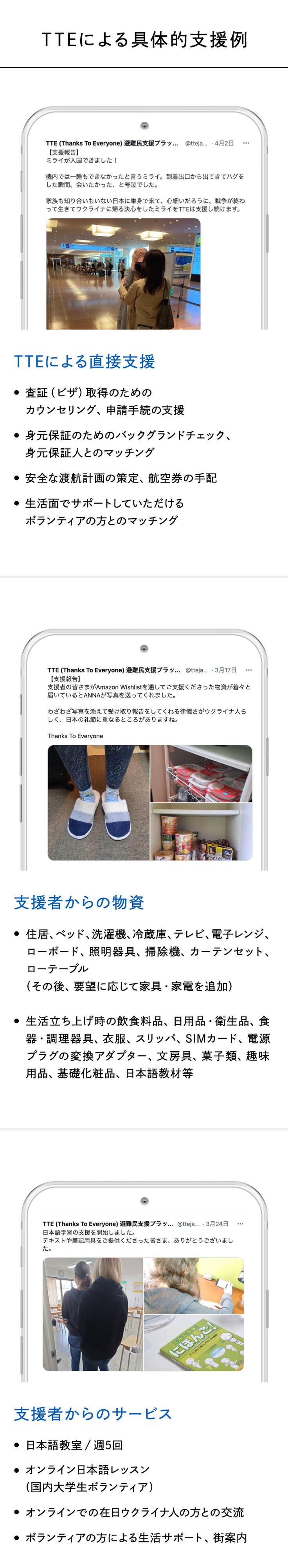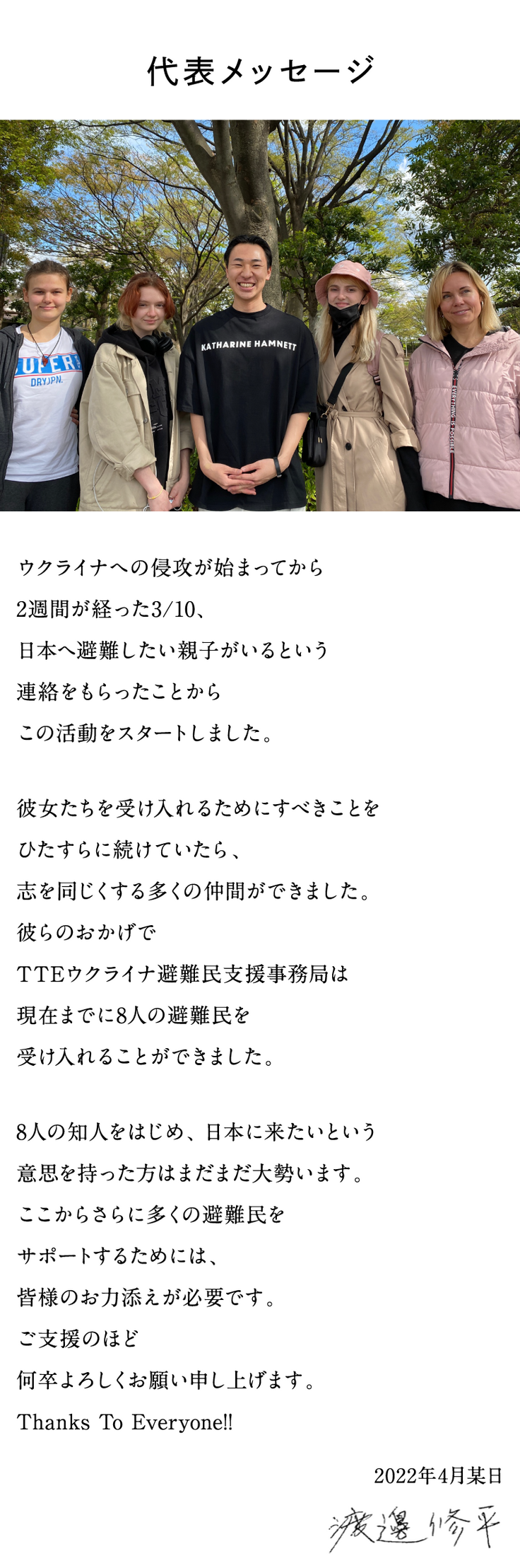 数多くの方からご支援やご声援を頂きまして、ウクライナ避難民のみならずTTE避難民支援協会としても大変励みになります。支援の在り方に正解がない中で、日々試行錯誤をしながら活動をしておりますが、みなさまのお気持ちを最大限活かせるように引き続き努めてまいります。