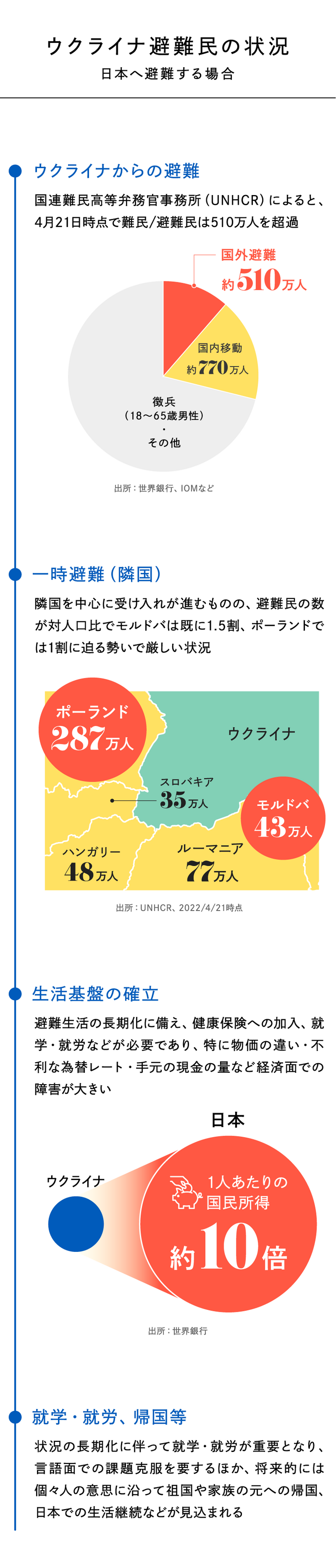 ポーランドやモルドバなどの周辺国の受け入れ能力が厳しく、また安全性への懸念もある中、日本への避難を希望する方もいます。入管庁によると、4月17日までで日本に入国した避難民の数は661人にのぼります(出所:NHK)。