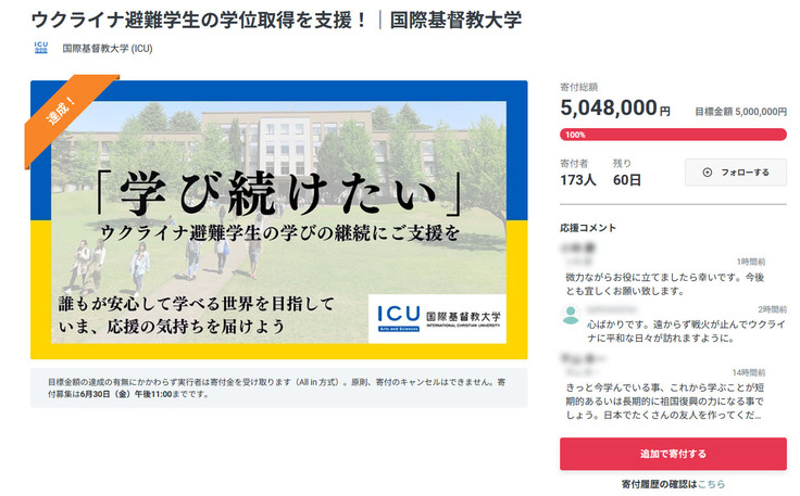 5月1日、クラウドファンディング開始から半月で「ウクライナ避難学生の学位取得を支援!」が無事に目標に達しました!