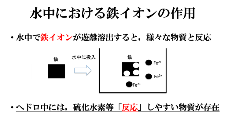 しかし最近、きれいになったと思える兆しが見え始めてきました。それは鉄炭電池(鉄炭密着ヘドロ電池※)の実験の成果です。鉄炭電池は、鉄と炭を組み合わせることによって電池の原理で二価鉄イオンが発生し水中に溶け出します。この二価鉄イオンが硫化水素や浮遊する有機物を吸着し、においを減らし透明度を高めます。(※特許番号 JP6650190)