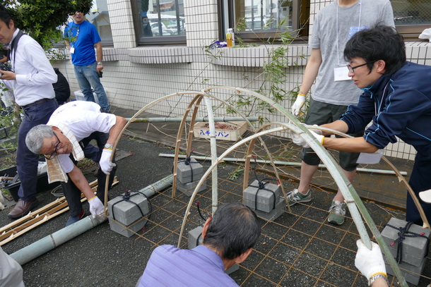 割った竹を組み合わせます。今はドーム型の竹魚礁を作っています。