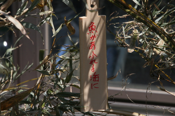メッセージや願いを竹短冊にしたため、竹魚礁に結わえつけます(このクラウドファンディングのリターンにも、この短冊のコースがございます!)。