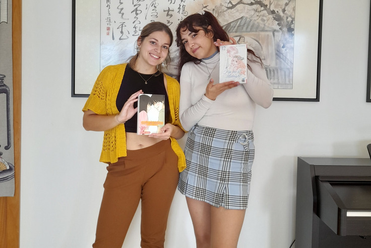 図書館にて、日本語専攻2年の学生と彼女たちが買った日本のマンガ(英語版)