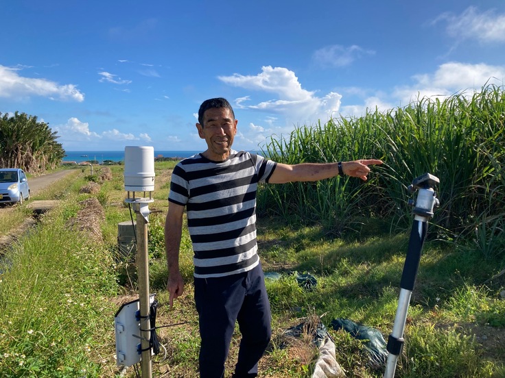株出栽培の支援を提案し、普及させた仲間(干川氏)とサトウキビ畑の実験圃場