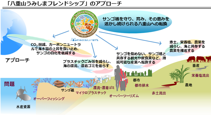 大切なのは、八重山の海の環境をサンゴの生息に適した状態に改善していくことなのです。つまり、汚水を減らす、赤土流出を減らす、サンゴを傷めない、海中や海岸のゴミを減らすなどの行動をもっと八重山全域に広めていく必要があります。そのようなことから、多くの方々と意見交換を重ね、八重山の海を守り育む輪を広げる「八重山うみしまフレンドシップ(※3)」プロジェクトを始めることに至りました。