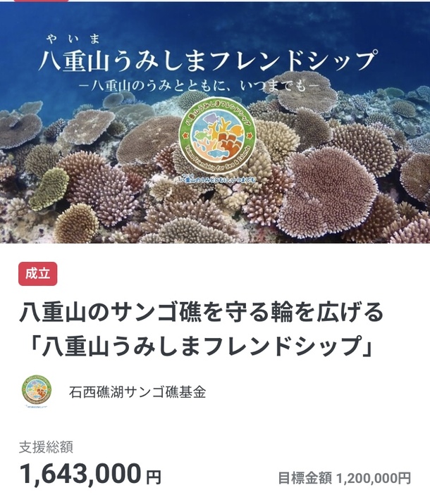 目標額120万円に対して160万円を超えるご寄付を頂きました。感謝申し上げます。皆さまのご支援、応援の賜物です。八重山うみしまフレンドシップの活動を活発化し、苦しんでいるサンゴを守っていくプロジェクトを具体化していきたいと思います。まずは御礼まで。ありがとうございました。