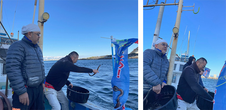 ご覧のとおり、強風で遠州灘沖合には出れず、遠州灘入口の今切口付近での放流となりました。親うなぎ50尾(16kg)と船1艘に10名が乗船し、第2回の放流活動を行いました。