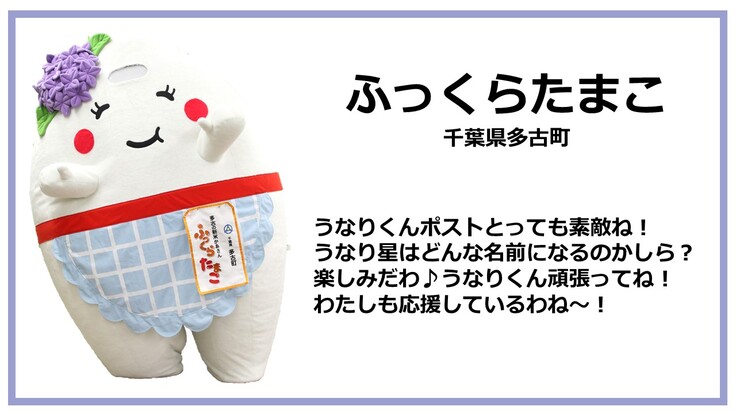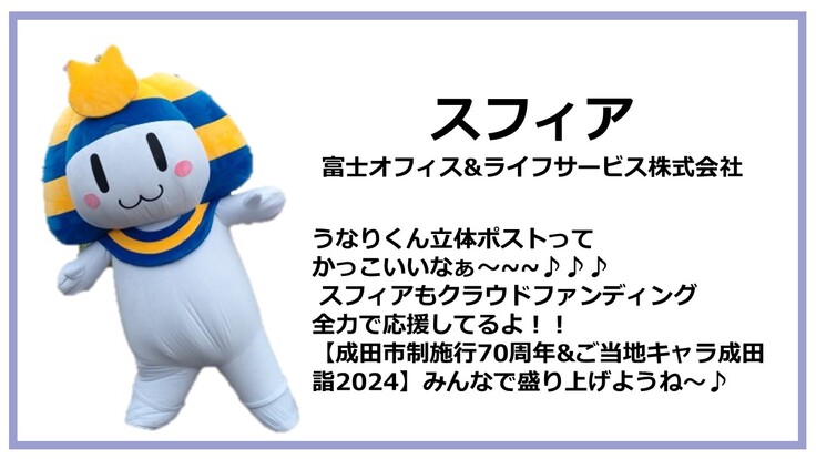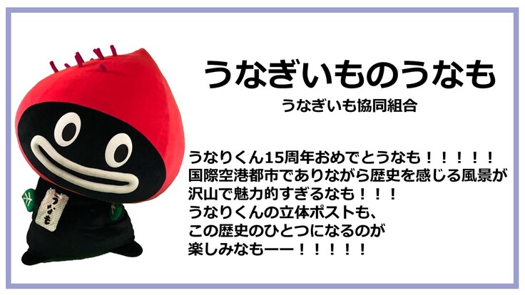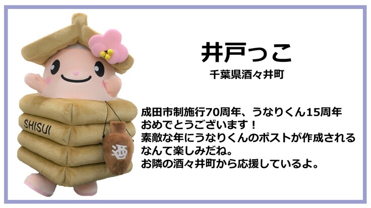 市制施行70周年の記念すべき年に、成田市を象徴する成田市役所の正面玄関にうなりくん型のポストを設置することができましたら、うなりくんの愛らしい姿で、来庁者の皆様や成田へお越しいただきました皆様をあたたかくお迎えし、心あたたまるスポットにしたいと考えております。