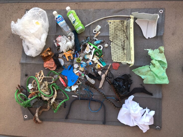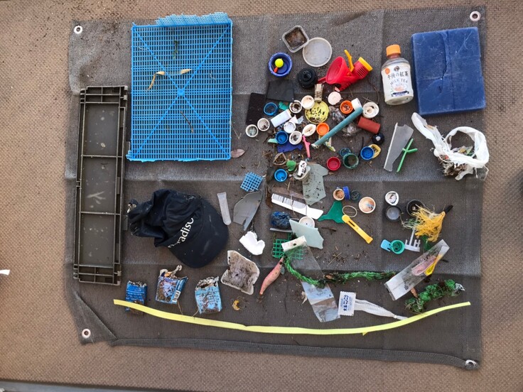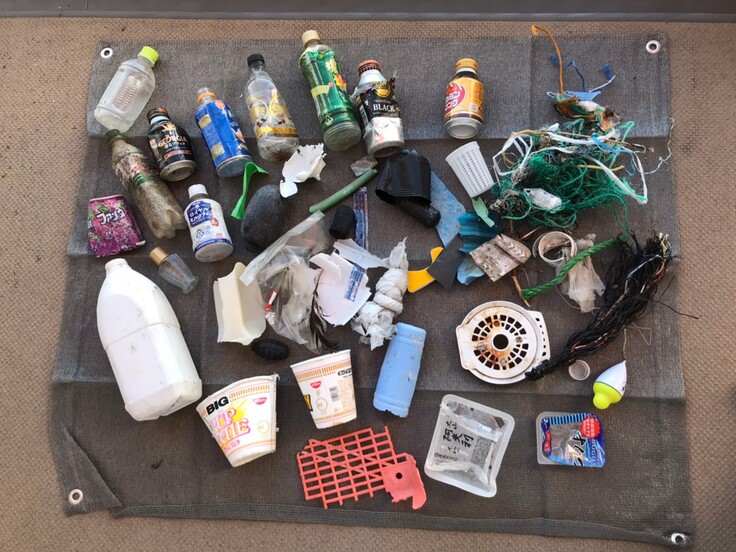 海で回収したゴミの写真です。この日は風が非常に強く、撮影を現地で行うと、回収したゴミが飛んでいってしまう恐れがあったので、家に持ち帰って撮影しました。