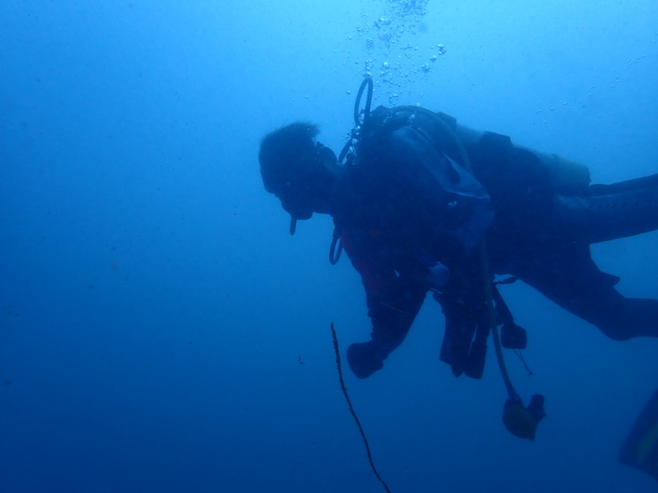 前日の海況は比較的良く潜水可能だったのですが、当日の朝方から徐々に海況が悪化し、波が高くなってしまいました。一本目の潜水は実行できたものの、透視度が1−3mとかなり水が濁っていた点、うねりが強く着底していても波に揉まれてしまう点からなかなかゴミを拾えるような状況ではなく、短めの潜水となってしまいました。