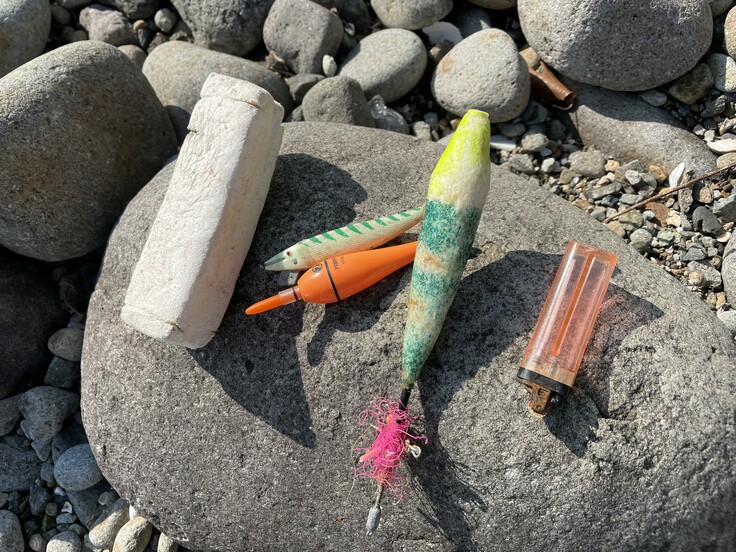 ペットボトル、発泡スチロール、プラスチック片、ビニール袋が大半を占め、他にはルアー、ライター、空き缶、靴、漁網などが目立ちました。