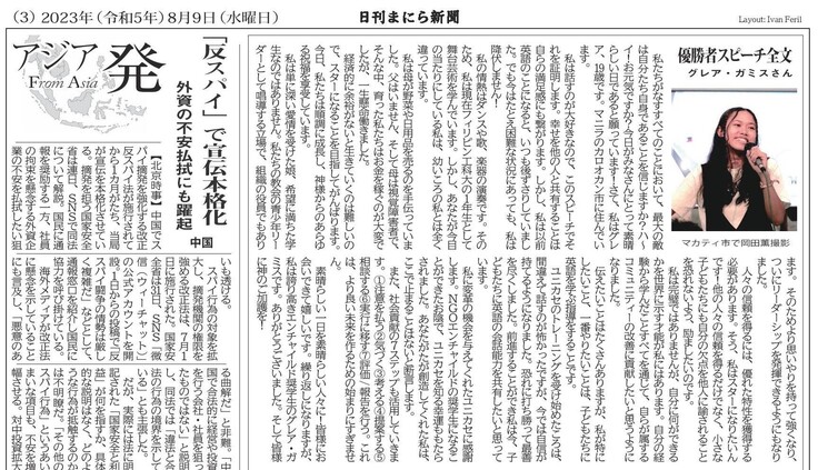 「スピーチコンテスト」の様子を現地のまにら新聞さんでも掲載していただきました。