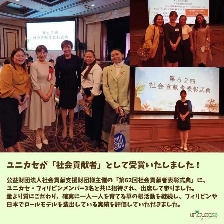 ユニカセが、量より質にこだわり、確実に一人ひとりを育てる草の根活動を継続し、フィリピンや日本でロールモデルを輩出している実績を評価していただきました。これまでの道のりは決して平たんなものではありませんでしたが、このような栄えある賞をいただき、これまで支えてくださった皆様に心より感謝申し上げます。これからもさらに前進して参りますので、引き続き応援いただければ幸いです。