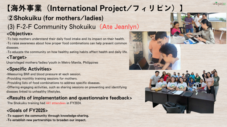 We have begun preparations to promote UNIQUEASE's projects and further increase the number of new Shokuiku trainers in FY2025 with the current Shokuiku trainers!