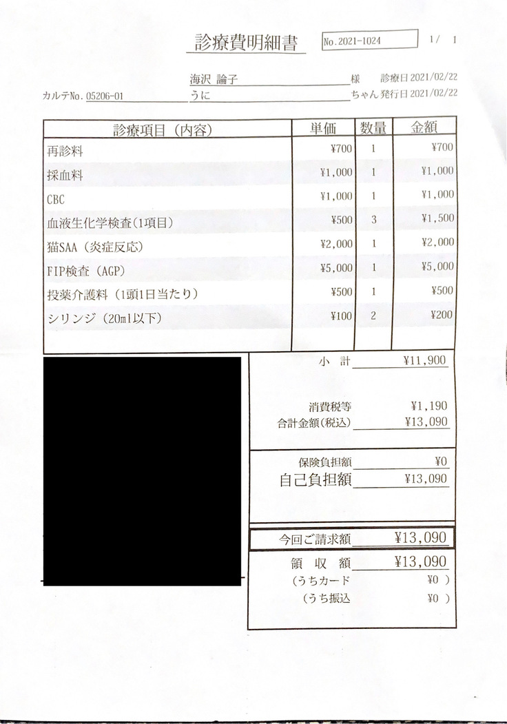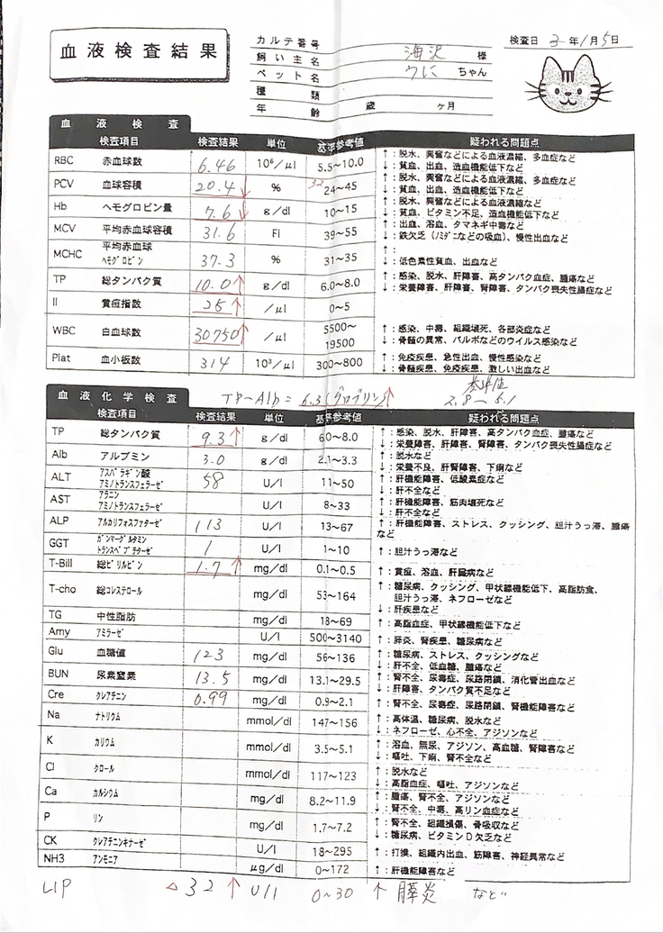 1週間以上経過しても、なかなか診断が付けにくく同じ治療をするしかないとのことでしたが、点滴治療開始して約2週間、腸のあたりに固まりのようなものがあることと、外部の血液検査の結果でFIP(猫伝染性腹膜炎)可能性があると診断されました。