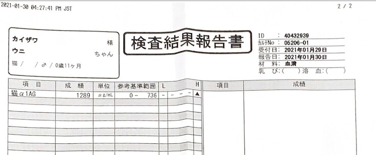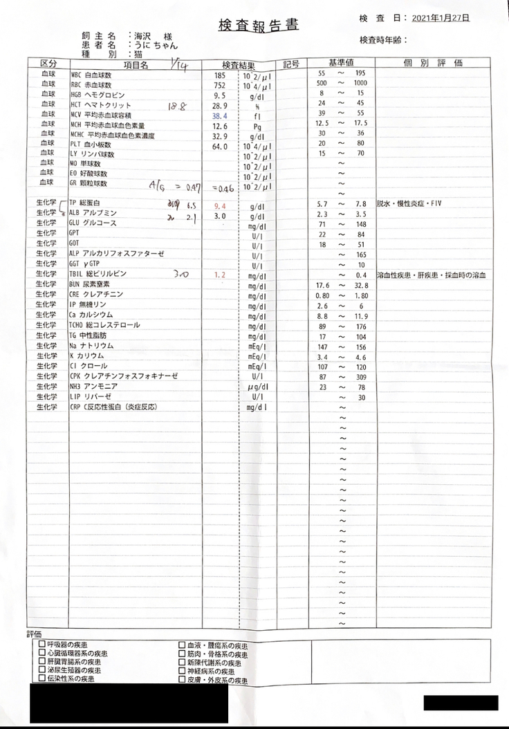 「残念ですがこのまま、うにちゃんの体力が持つまでこの治療を続けて行くしかありません」と言われ、このままこの治療方法に従って諦めるしか無いのかと落胆していたところ、FIPの協力病院があることを知り、自宅から近い協力病院に連絡するも、お薬の在庫がないとの事でご紹介にて臨時で次に近い協力病院(自宅から2時間半の距離)受診にて2021年1月17日、かかりつけ動物病院の血液検査を参考に、貧血の追加検査で数値が14%ということで『FIP、猫伝染性腹膜炎のドライタイプの中後期』と診断されました。