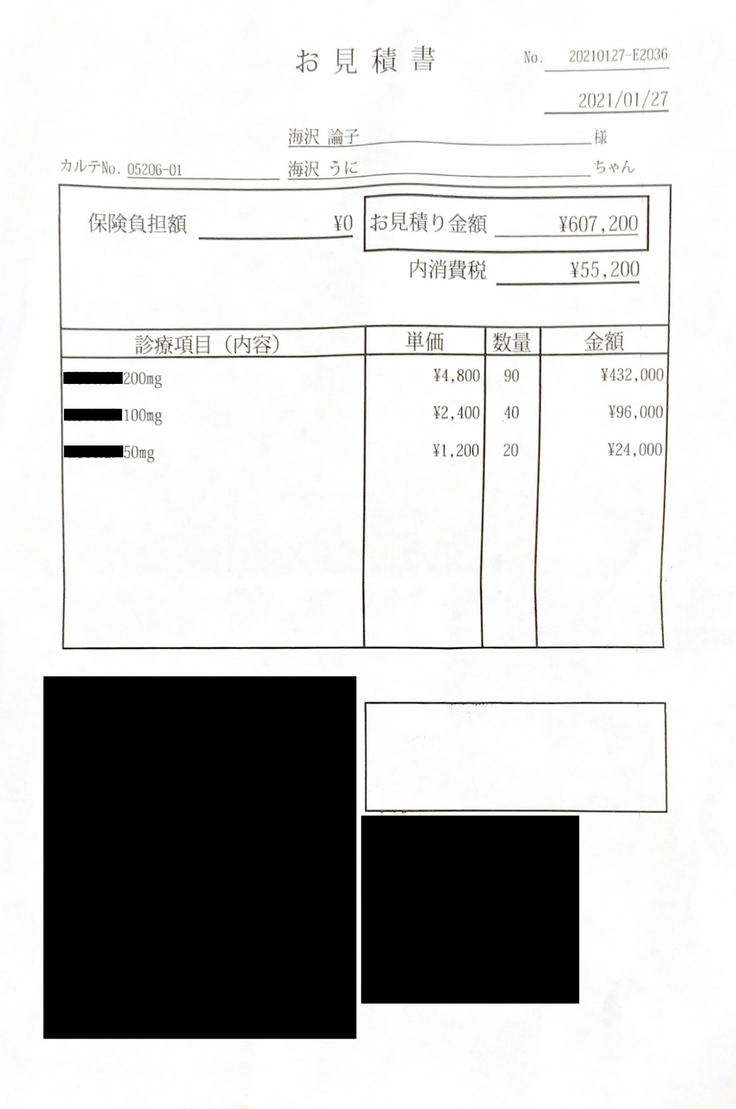 内服薬200mg⇒4800円×39カプセル、100mg⇒2400円×1カプセル、合計194040円(税込み)