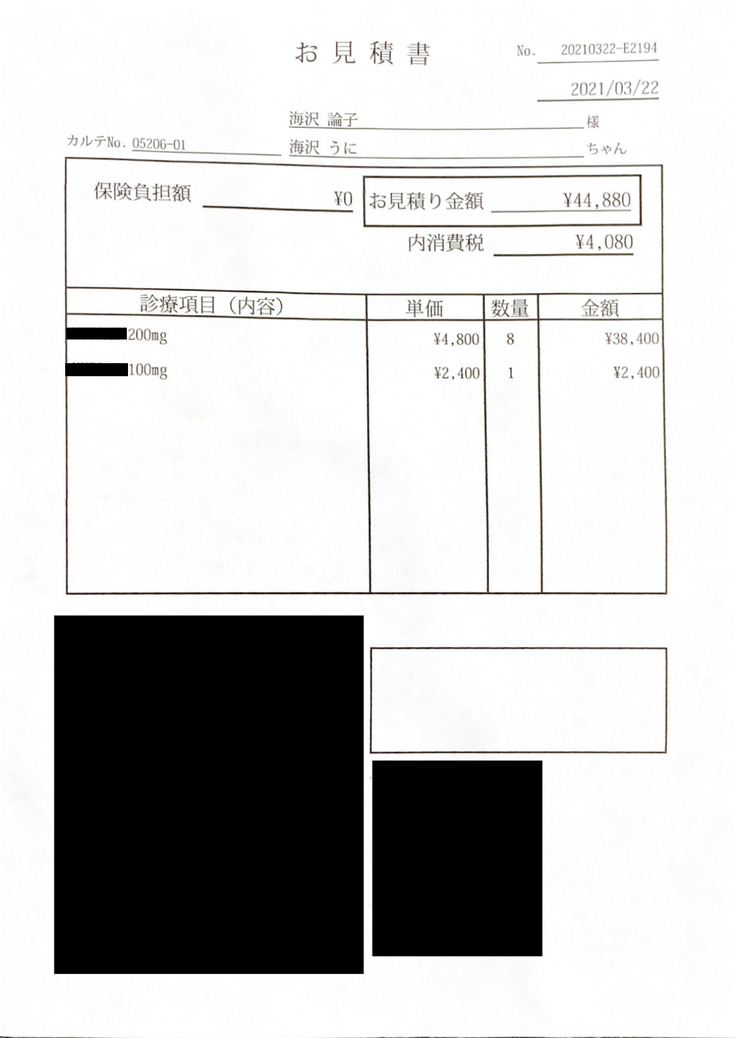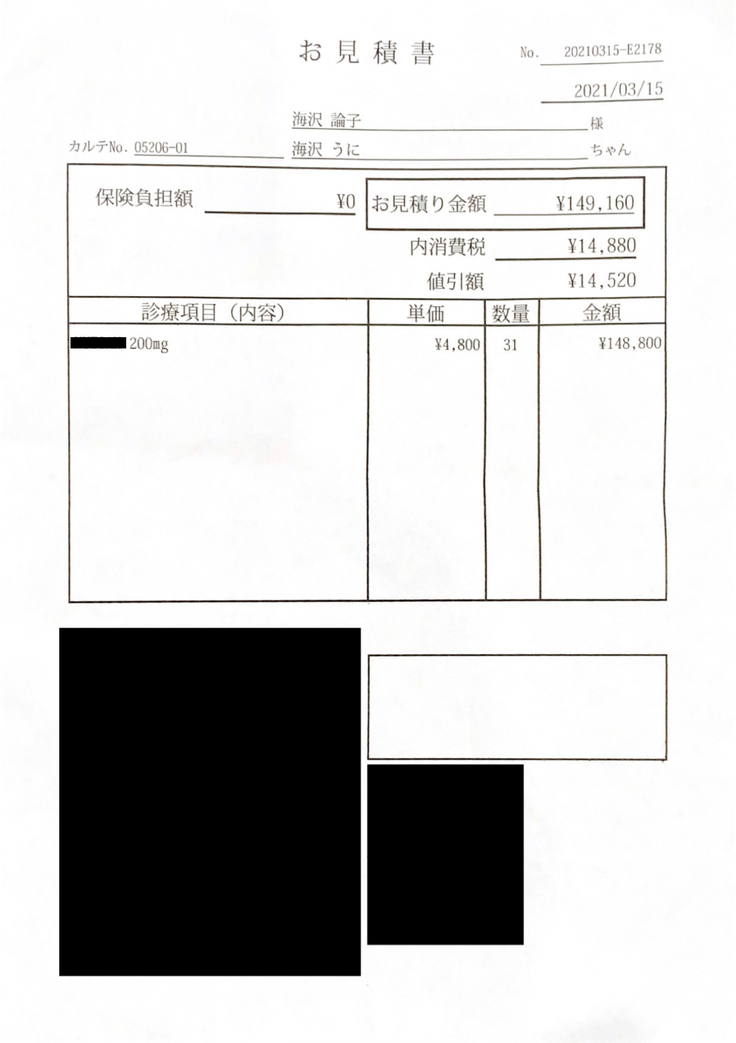この治療薬は大変高額なお薬な為、うにの治療には総額170万円程の金額が必要になります。