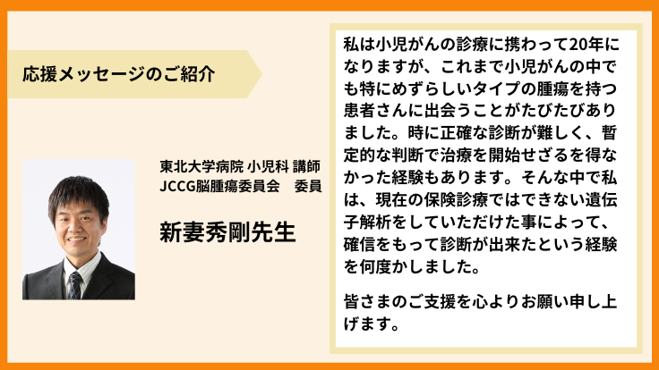 このようなケースを幸運と考えず、日本中で、メチル化解析を必要とする全ての小児脳腫瘍の患者さんたちに検査の機会を届けられるよう、皆さまのご支援を心よりお願い申し上げます。