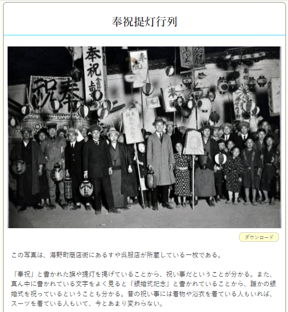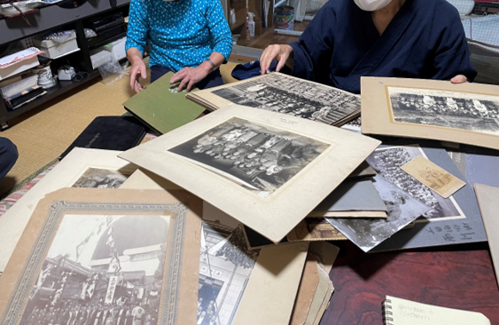 1.海野町商店街の人に、昔の町の様子が分かる古い写真を持ち寄ってもらう。写真ごとに年代や当時の様子など説明文を付け足すための話を伺う。