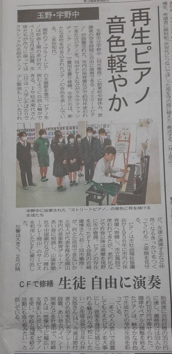 少し前になりますが、宇野中学校さんが山陽新聞社さんから取材を受け、このピアノのことが全県版に掲載されました。