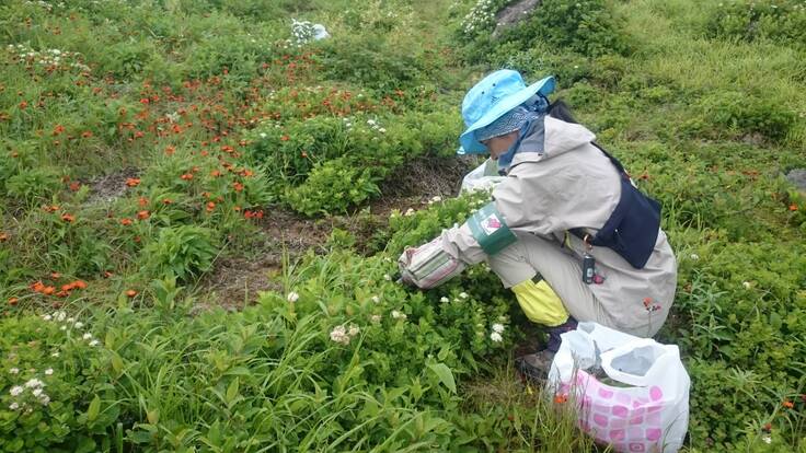 活動はすべて人の手で行います。コウリンタンポポ防除は夏の暑いさなか、登山をしてからの作業であり、中には30~40kgの防除した物を背負って降りてくれる方もいます。
