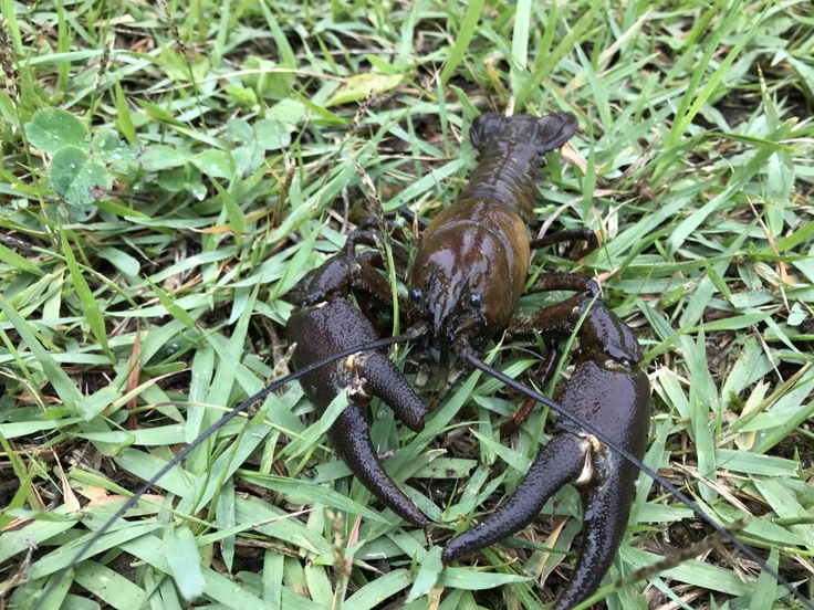 「ウチダザリガニが籠にかかっている様子 肩身の狭い思いをして一緒に住んでいた在来の水生小動物が喜んでいるかも・・・」