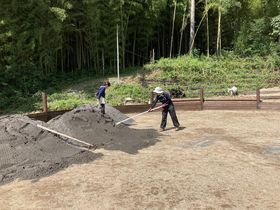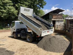 雨の影響により、窪んだり土が流れたりする前に砂を敷いたほうがいいでしょう、ということで、いつもお世話になっている坂本建設さんに砂の搬入を依頼しました。