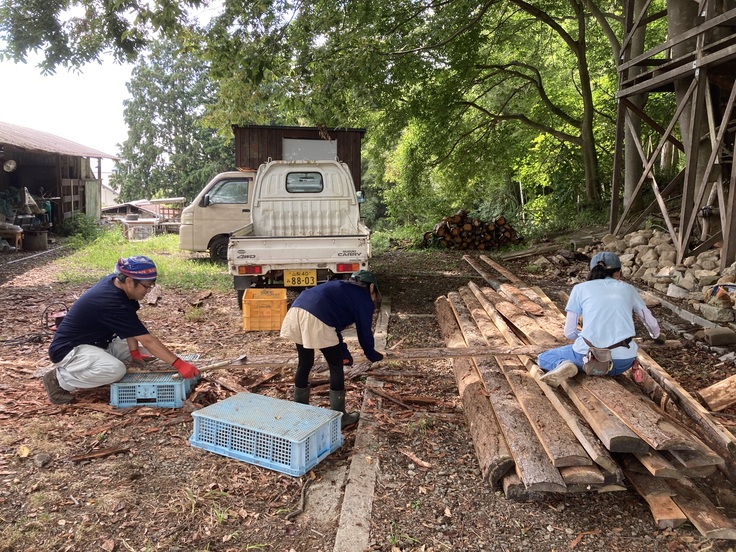 清水馬三昧さんのところから運んできたカラマツ材は、馬小屋の外壁部分に用いる予定とのことで、皮を剥いでからサンダーでやすりがけを施すことに。