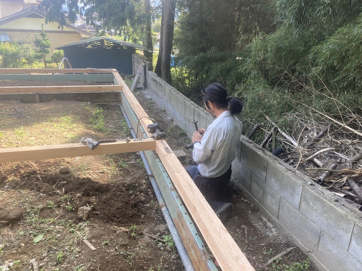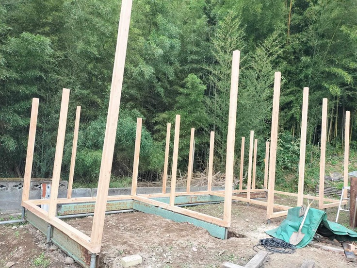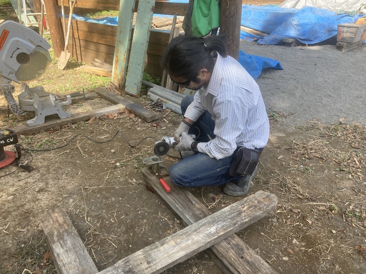屋根の勾配を考えながらカラマツ材をカットし、地中に埋められている各単管パイプの上部に乗るように設置していきます。