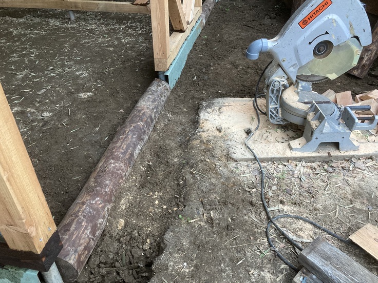 馬小屋内に雨水が浸入しないよう、鉄板と丸太を駆使して土留めを設置。