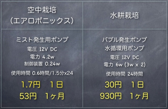 下記は小型(20ポット)の空中栽培装置と水耕栽培装置とで比較した電気料金目安です。(LED照明は含まれていません)空中栽培では水耕栽培の約1/18の電気料金です。多くの植物工場では水耕栽培を採用しており、ランニングコストを下げるために大規模な栽培が必要になりますが、空中栽培では省エネルギーで栽培を行う事ができます。