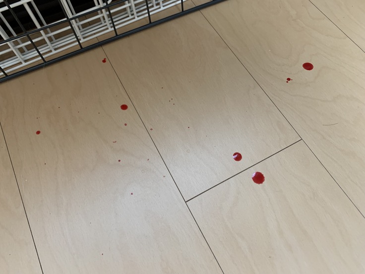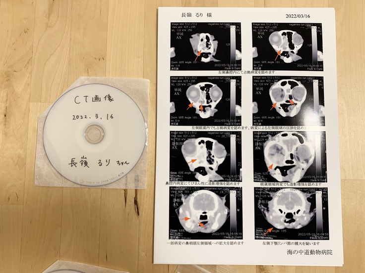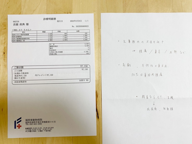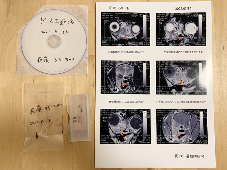 ▼3/4 鼻血が出たのは初めてだったので、病院が休診日だったのもあり、以前先住猫を診てもらっていた別の専門医に掛かりました。病院設備的に出来る事としてレントゲンをしてもらいました。結果、左鼻腔内一部の透過性が悪く、鼻腔内に腫瘍がある疑いが強いとのことでした。