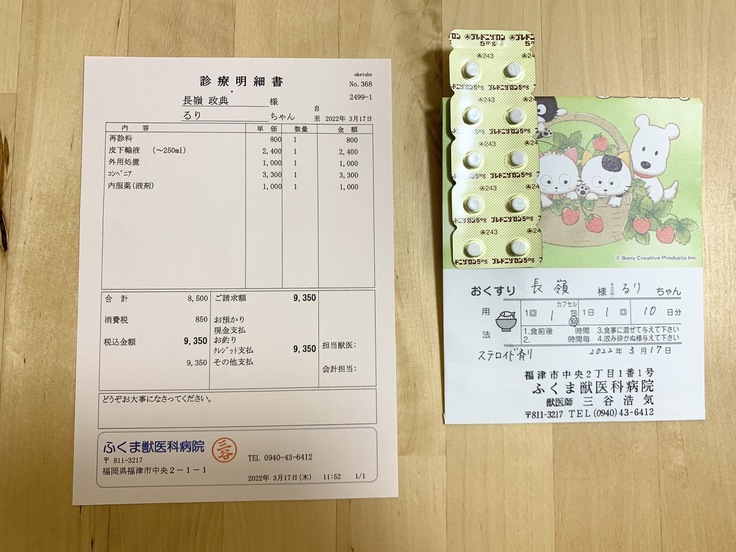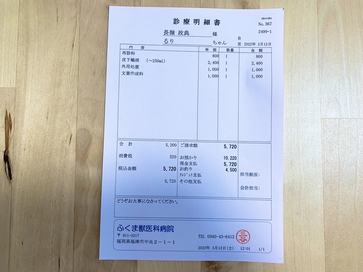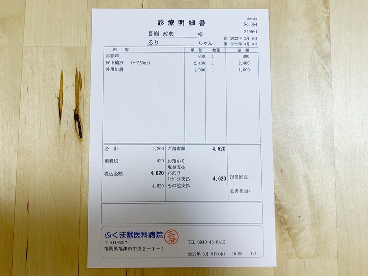 ▼3/12 前回と変わらず元気が無いため、この日も点滴を受けに来ました。状態も悪く、このまま病名がはっきりしないままだと何もできないので、検査代の立替えをなんとかお願いし、CT・MRIの検査予約をしてきました。