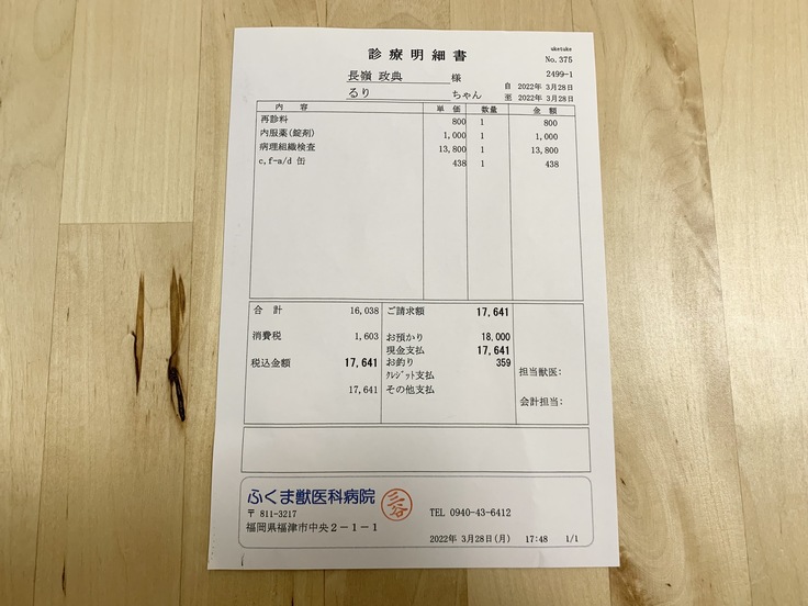 処方:ステロイド錠剤/ 病理組織検査料/ 回復食缶詰