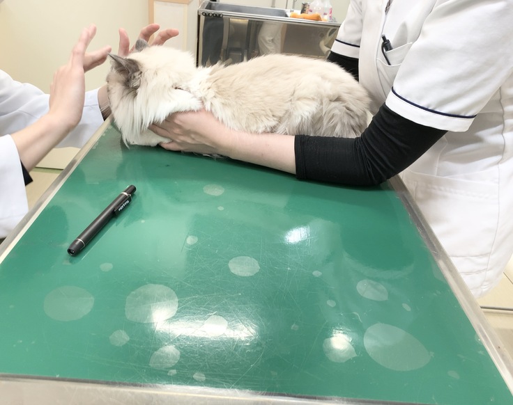 先生がうりまるの顔のまえに手を急に近づけたり、離したり、、