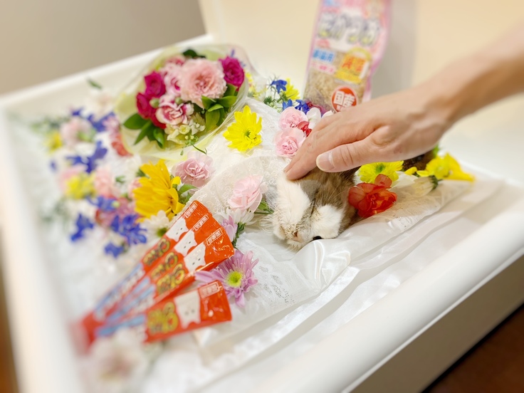 うりまるはたくさんの花に囲まれて、いつもより少しだけ気の抜けた優しい寝顔をしていました。