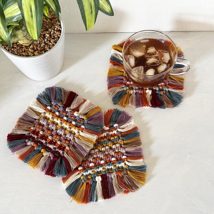 コップはもちろん、観葉植物の下に敷いたり小物置きとしてもご使用いただけます。糸のカラーをmixして作ったので、糸の温かみを感じられる作品に仕上がっています。