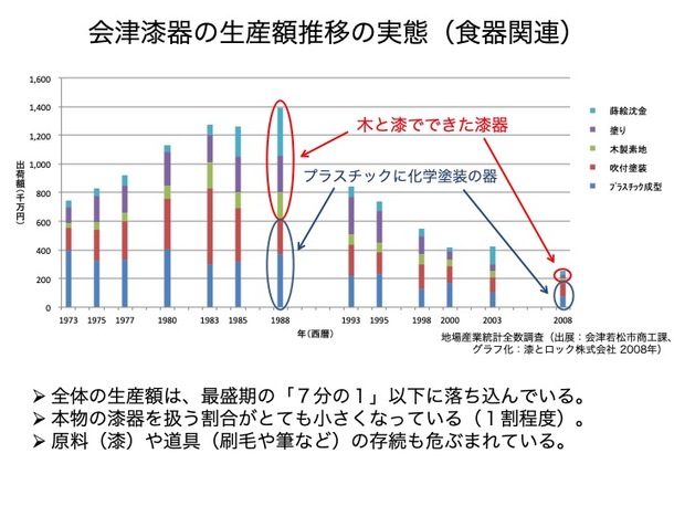 昨日お見せしたこちらのデータ。会津漆器の生産額推移のグラフです。
