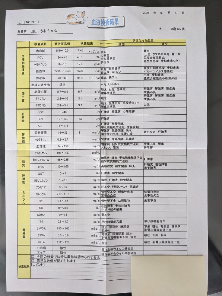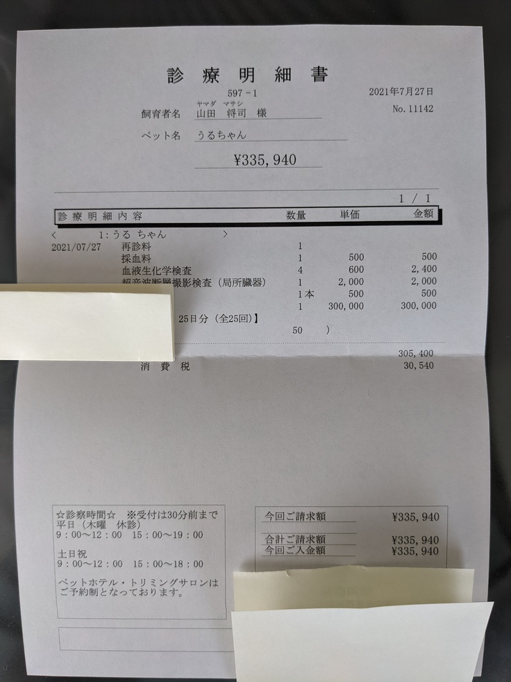 本日7月27日、薬剤も少なくなってきたので協力病院へ4回目の通院に行きました。うる自身は症状も無く元気だったので心配はなかったですが、少しドキドキしながら。今回は血液検査とエコーのみでした。血液検査も回復傾向ですべて適正値でした。体重が増えており今残っている4日分が終わったら増量にしましょうとのこと。服薬は84日連続になりますが、残り29日となります。なので処方は4日分引いた25日分の処方になりました。薬剤費だけで30万円(税別)となりました。このまま約1カ月後に検査、さらに1カ月後と3カ月後と経過をみていきます。このまま何もなくいくことを切に願っております。