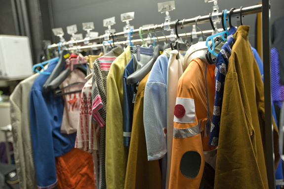衣装がハンガーに並んでいます。ネームプレートを付けてでわかりやすく。
