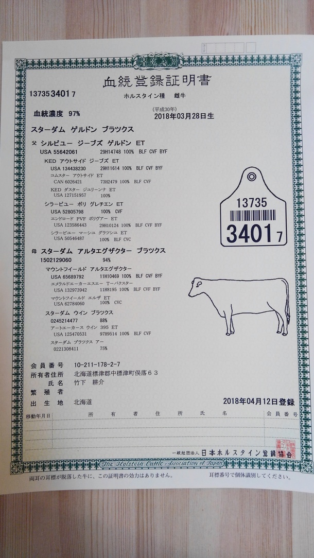 実際に下の証明書のコピーと、名前をつけた子牛の写真を送ります。
