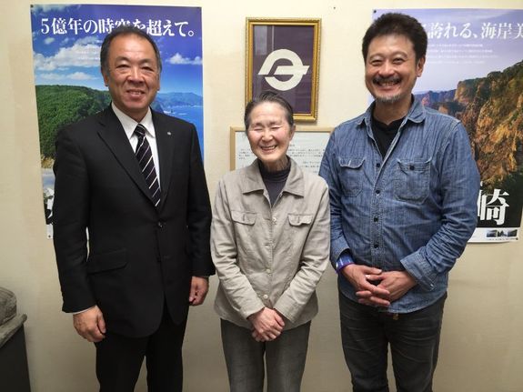 田野畑村村長室にて 石原弘村長、工藤房子さんと