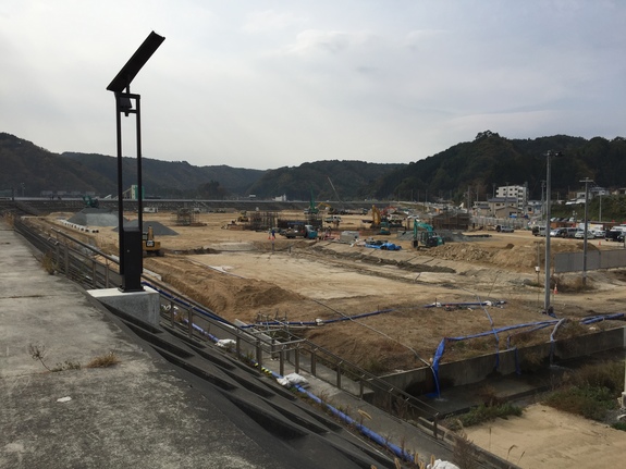 (万里の長城と言われた宮古市田老の防潮堤より復興が進む町を望む)