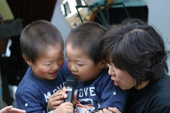 (お母さんの熱唱を足元に抱きつきながら応援♪♪)