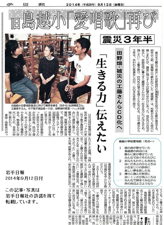田野畑村愛唱歌CD制作プロジェクトを代表の出淵よりお伝えします。