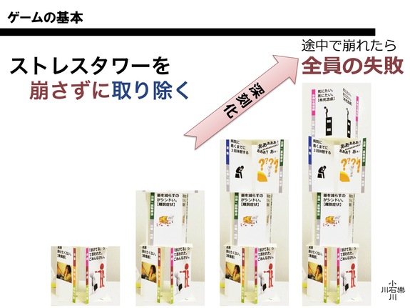 ゲームクリアは、【ストレスタワー】と呼ばれるカードで作ったタワーを全て取り除く事です。