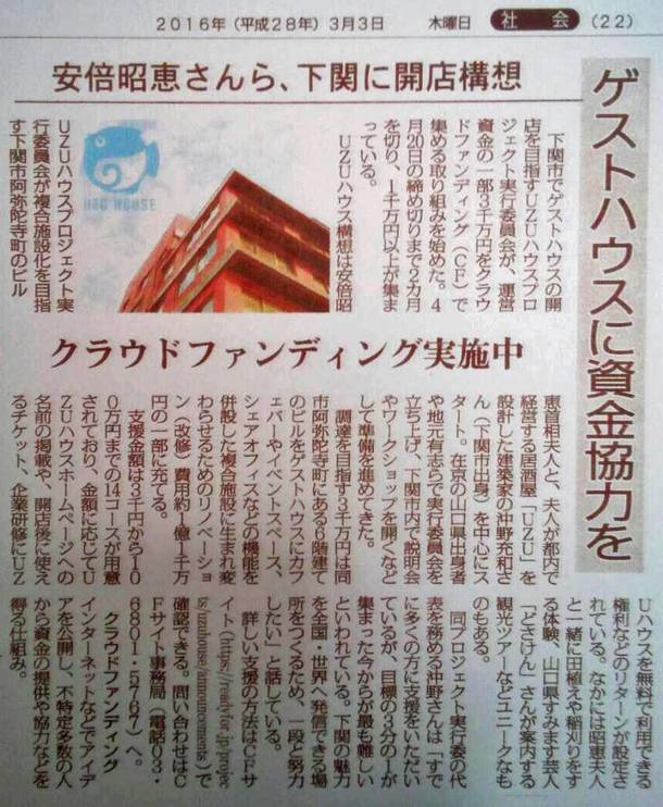 3月3日付け山口新聞の社会面で、ウズハウスのことが記事になりました!