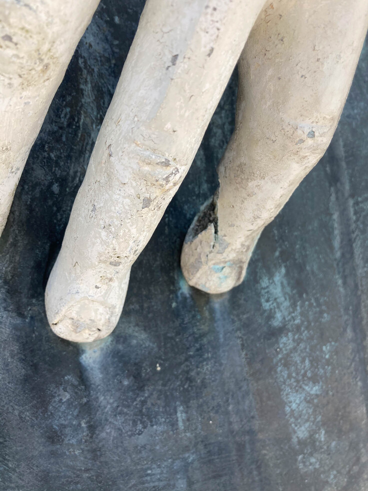 また、顔や手、足に塗られた白い顔料も剥がれてきてしまっていました。触ると、顔料がぽろぽろと落ちてきてしまう状況でしたので、今回のメンテナンスではその剥がれを抑え、一部リタッチを行っていただいています。
